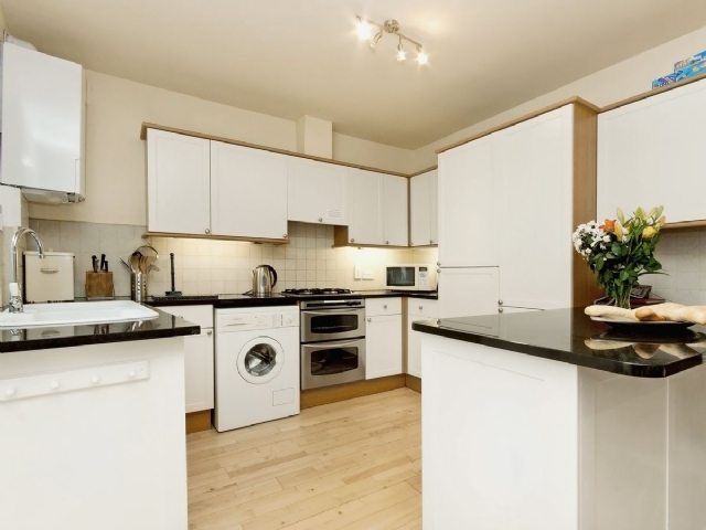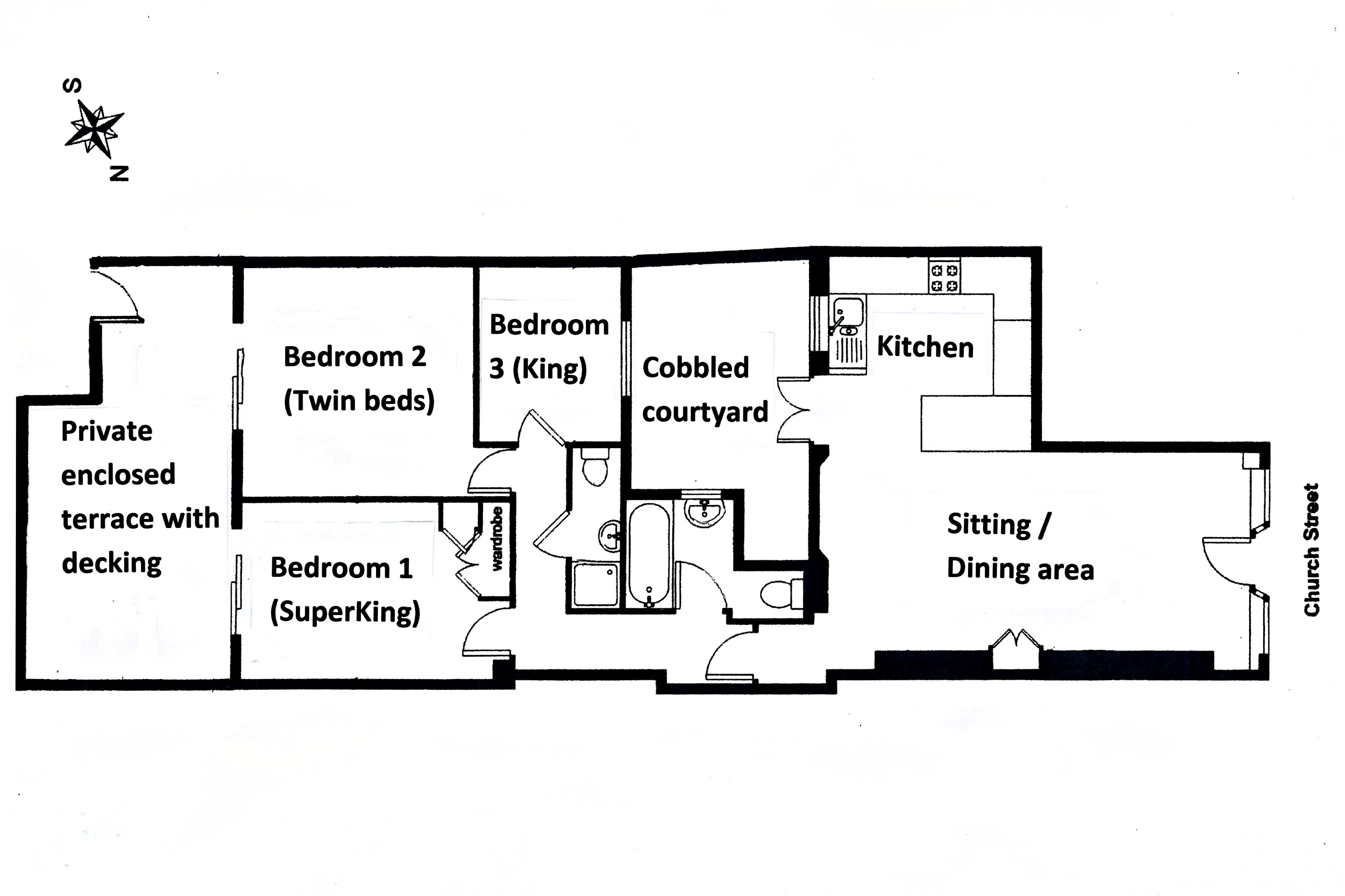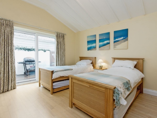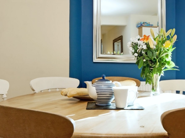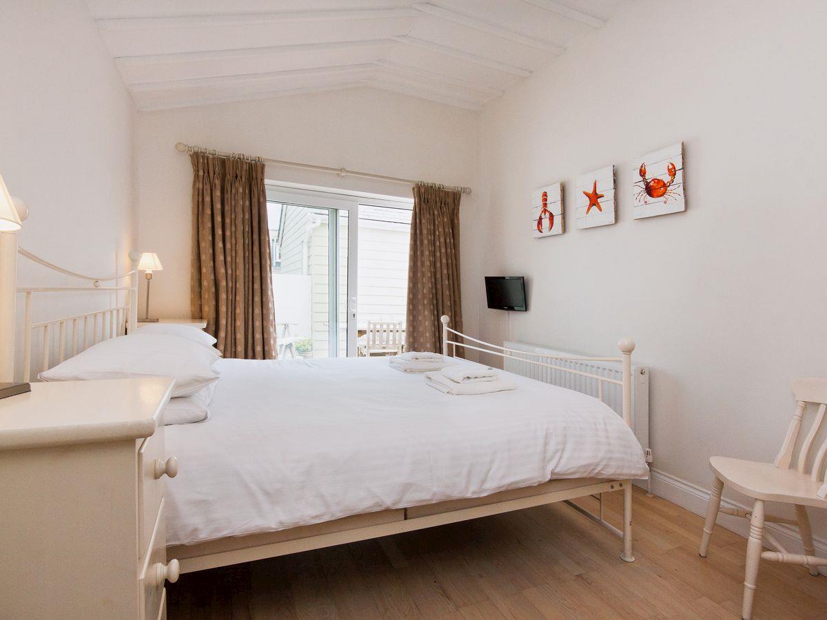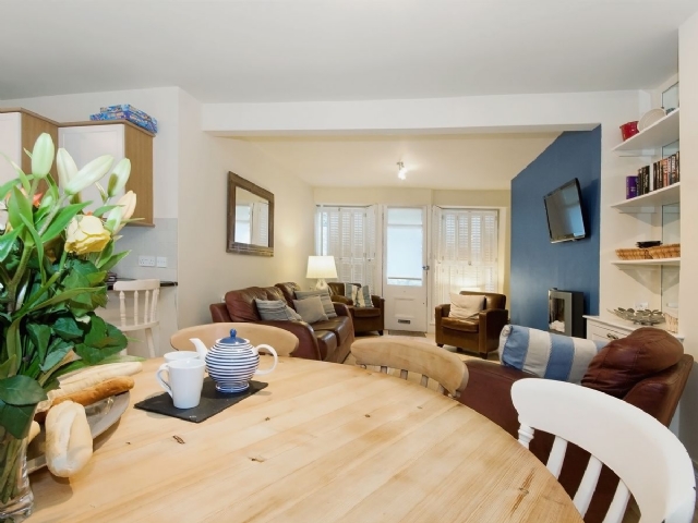 The property is well furnished and decorated, and offers good quality accommodation in a highly sought after location. The spacious open plan Kitchen/Sitting/Dining Room has ‘junkers’ stripped wooden floor throughout; electric flame effect fire; and TV/DVD, with double doors out to a sheltered courtyard. The Kitchen area is fitted with granite worktops and modern appliances ideally suited for holidaymakers.
