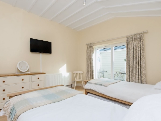Comfortable beds is a feature – Bedroom 1 has a super king-size double bed (6′), TV, sliding patio door out to teak decked terrace. Bedroom 2 has two single beds with stora beds under (total of 4 x 3′ beds,) TV/DVD, sliding patio door out to decked terrace. Bedroom 3 has a king sized bed (5″). There is a newly fitted family bathroom with Aqualisa shower, luxury bath, basin and WC. There is also a newly replaced shower room with Aqualisa shower, basin and WC.
